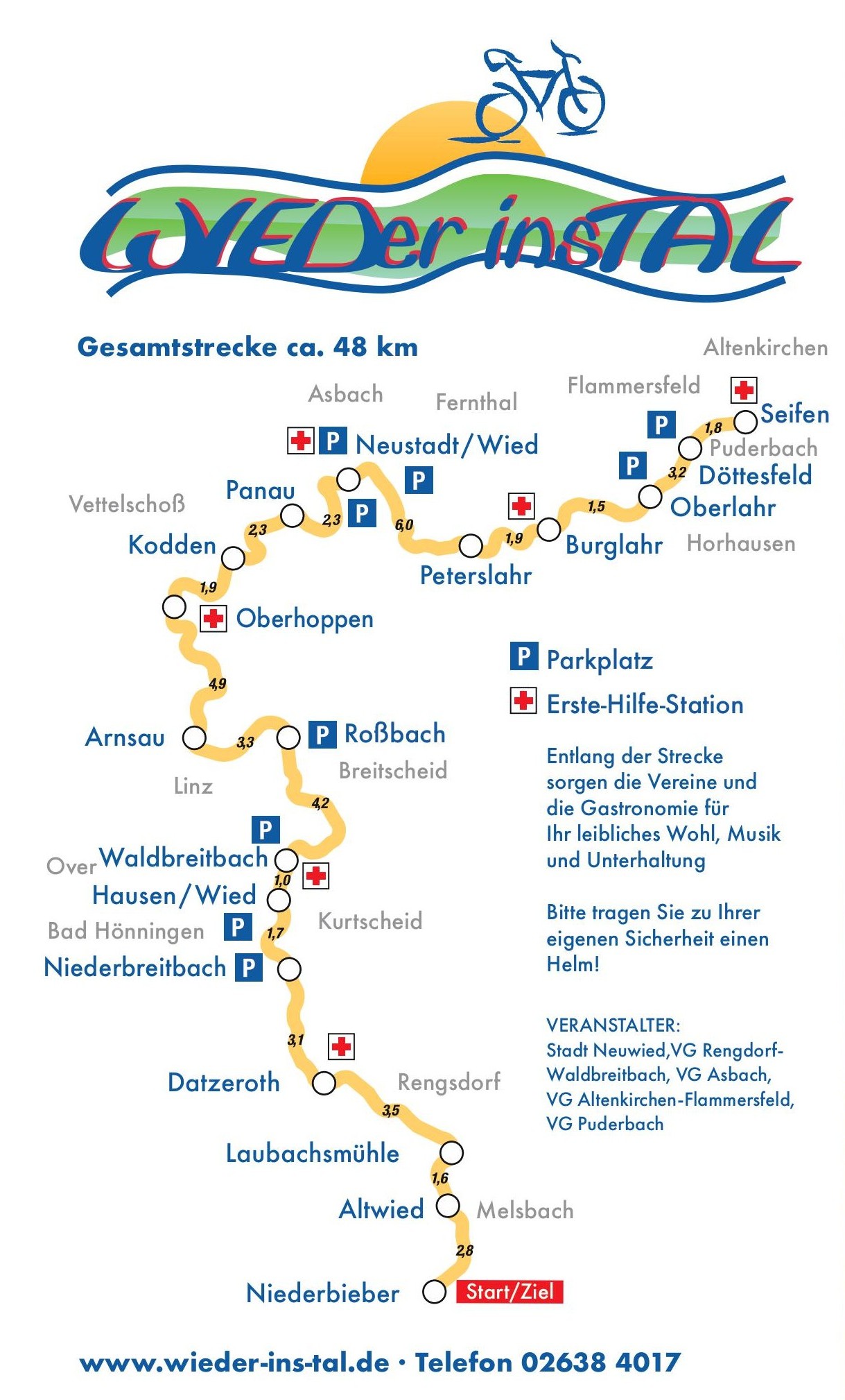 Der Radwandertag findet in den Landkreisen Neuwied und Altenkirchen statt. Veranstalter sind die Verbandsgemeinden Rengsdorf-Waldbreitbach, Asbach, Altenkirchen-Flammersfeld und Puderbach sowie die Stadt Neuwied. Unterstützt werden sie von den Sparkassen Neuwied und Westerwald-Sieg, der VR Bank RheinAhrEifel und der Raiffeisenbank Neustadt. Polizei, Rettungsdienst und Feuerwehr sind im Einsatz und gewährleisten einen sicheren Verlauf der Veranstaltung. Die Regio-Linien 125 und 130 verkehren an diesem Tag nicht. Die Veranstalter bitten darum, zur eigenen Sicherheit Fahrradhelme zu tragen.