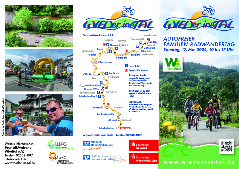 Am Sonntag, 17. Mai 2026 findet von 10:00 – 17:00 Uhr der nächste Radwandertag WIEDer ins TAL statt. Die Landesstraße L255 und L269 im Wiedtal ist auf 48 km von Neuwied - Niederbieber bis Seifen im Westerwald nur für Fahrradfahrer, Inlineskater und Fußgänger geöffnet. Start ist in diesem Jahr wieder am Schulzentrum in Niederbieber in der Augustenthaler Straße 49. Hier stehen kostenfreie Parkplätze bereit.